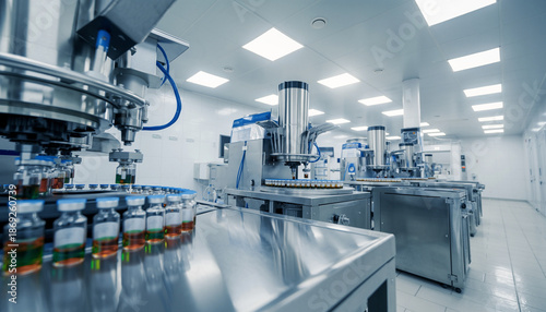 A sterile illustrated pharmaceutical production facility with advanced medicine-processing machinery.