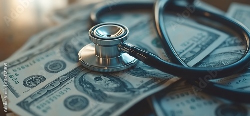 A stethoscope rests on a pile of cash, symbolizing healthcare costs.