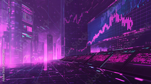 A stock market chart with upward-trending lines, surrounded by a digital cityscape and financial graphs