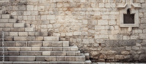 A stone wall with stairs leading up to it features a window. The brickwork adds contrast to the rectangleshaped building. The city view highlights the intricate patterns of the stone