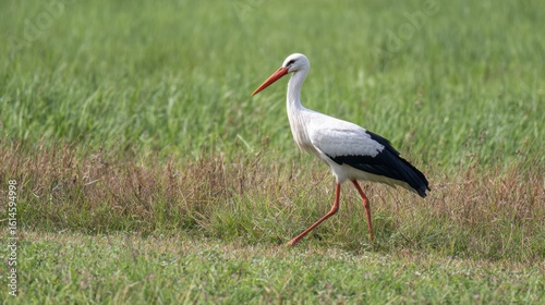 A stork moves calmly across a vibrant green field, its long legs striding smoothly. The clear blue sky enhances the serene environment, captured on a bright day.