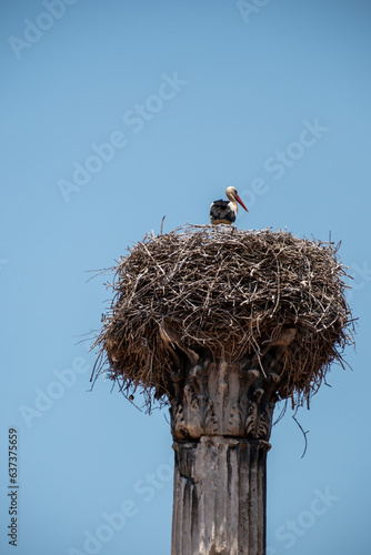 A stork resting on its nest on a Roman column in migration season