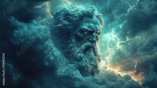 A stormy sky with Zeus emerging from the clouds, his face illuminated by flashes of lightning