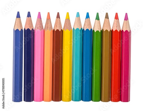 A straight line of twelve brightly colored wooden pencils, sharpened and isolated on a clean white background. Perfect for themes of education, art, and creativity.
