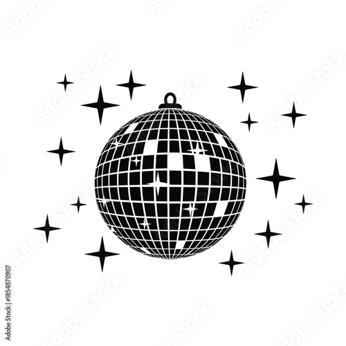 A striking black and white disco ball with surrounding starbursts a captivating silhouette