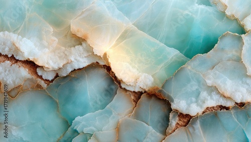 A striking close-up view of a natural stone, showcasing intricate patterns of pale teal, creamy white, and warm gold tones.