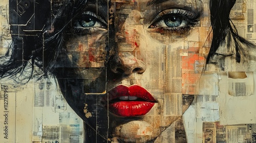 A striking portrait of a woman with bold red lips and piercing blue eyes, featuring a collage of newspaper textures and artful brushwork.