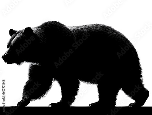 A striking silhouette of a powerful grizzly bear strides forward isolated against a plain white background.