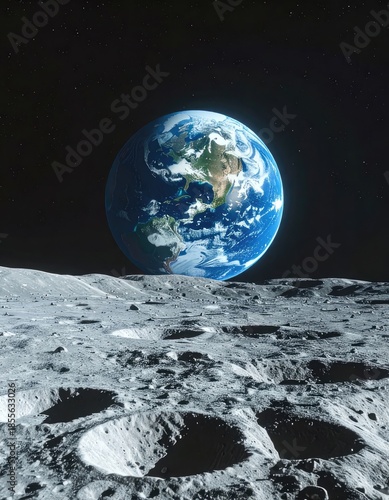 A striking view of planet Earth rising over the rugged, cratered surface of the Moon in deep space.