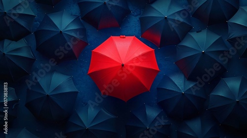 A striking visual showcases a bright red umbrella prominently positioned among numerous dark umbrellas, emphasizing contrast and uniqueness in a unified arrangement