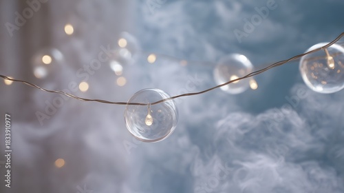 A string of delicate illuminated glass spheres with glowing lights drifts through a soft misty atmosphere