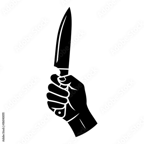 A strong hand gripping a sharp kitchen knife in a bold black and white silhouette