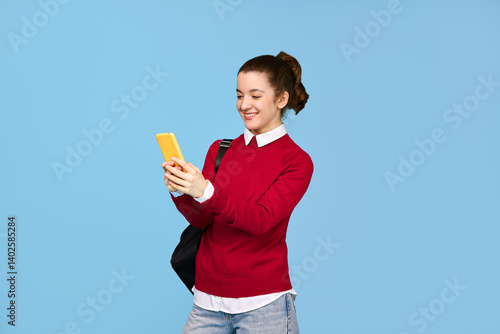 A student girl is looking at her phone.