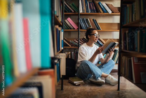 A student stuying and reading books in a public library.