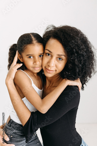 A studio photograph of an African American mother and daughter embracing / hugging.