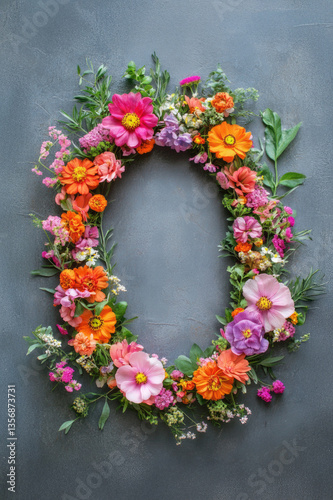 A stunning arrangement of bright flowers creating a wreath on a dark background, symbolizing love, celebration, and the vibrancy of nature's beauty.