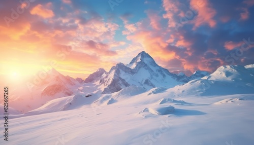 A stunning dramatic sky with vibrant snow winter frozen mountains landscape, beautiful sunset view, cool place in Antarctica