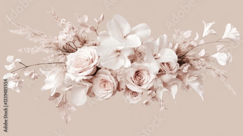 A stunning floral composition of soft pastel roses, peonies, and lilies, delicately set against a vintage beige background.