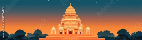 A stunning illustration of a majestic temple at sunset, framed by serene landscapes and a starry sky, perfect for cultural themes.