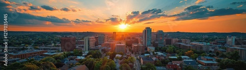 A stunning panoramic view of a city skyline at sunset, showcasing the interplay of light and architecture against a vibrant sky.
