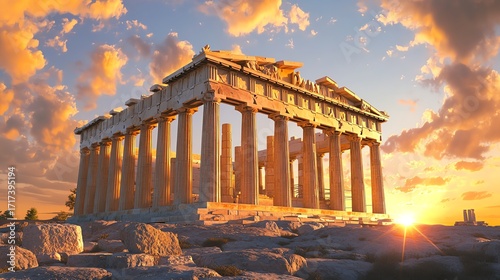 A stunning photo-realistic image of the ancient Greek Parthenon at sunset, showcasing glowing marble columns and intricate details.