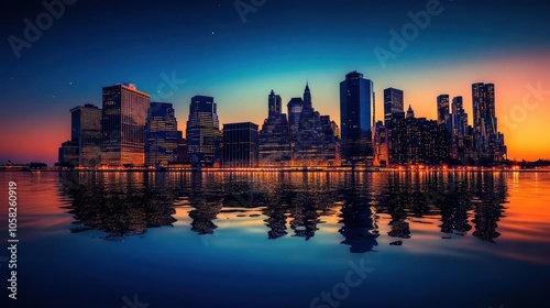 A stunning skyline at sunset, reflecting on water, showcasing urban beauty and tranquility.