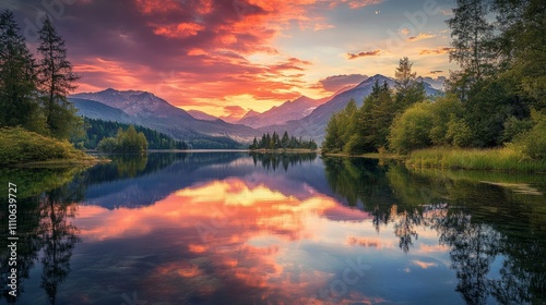 A stunning sunset over a serene lake, with reflections of mountains and trees in the water