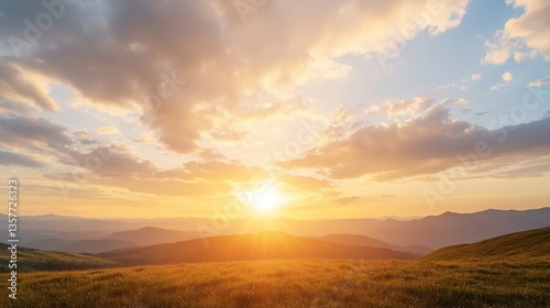 A stunning sunset over rolling hills, casting golden light on the landscape with a dramatic sky filled with clouds.