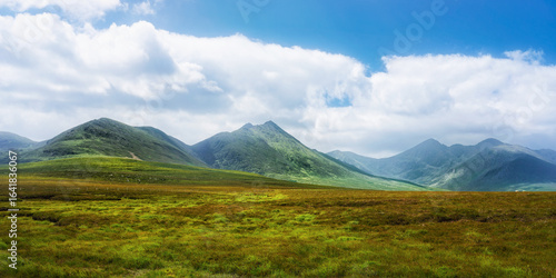 A stunning view of Ireland's rugged and beautiful landscape, green hills and mountains meeting the sky.
