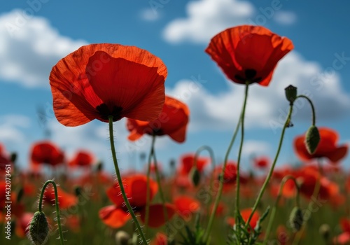 A stunning view of red poppies blossoming in a field, set against a backdrop of a blue sky.