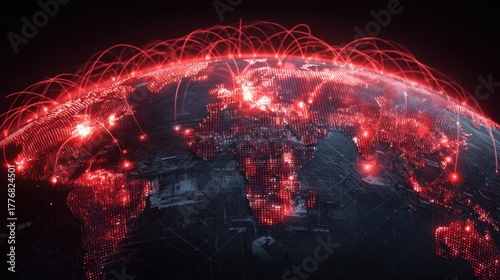 A stunning visual shows a globe illuminated by dynamic red lines representing digital connections across continents.