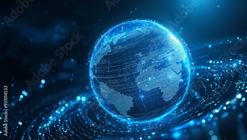 A stunning visualization of Earth through a high-tech lens, showcasing intricate digital patterns and vibrant blue lights, representing connectivity in a cosmic space.