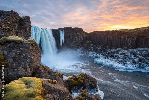 A stunning waterfall cascades over basalt columns in Iceland, with icy formations and a vibrant sunset sky adding to the scene's beauty.