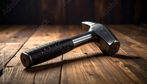 A sturdy metal hammer with a textured grip rests on dark wood planks
