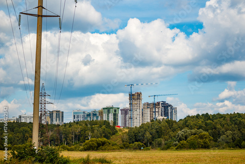 A sturdy power pole dominates the foreground, with new urban high-rises under construction rising above a green forest under a dynamic cloudy sky