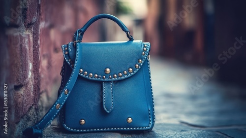 A Stylish Blue Handbag Sitting Beside A Brick Wall