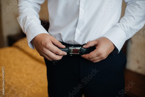 A stylish man puts on a leather belt close-up. Fashion