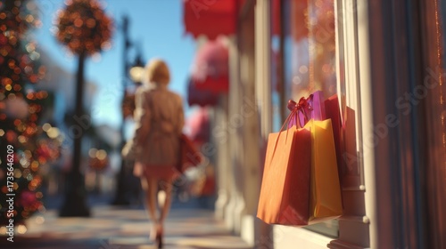A stylish woman walks past a shop adorned with festive decorations, carrying colorful shopping bags, evoking holiday cheer.
