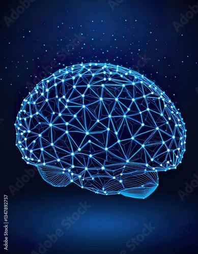 A stylized 3D digital rendering of a human brain depicted as a glowing network of interconnected nodes and lines against a dark blue background