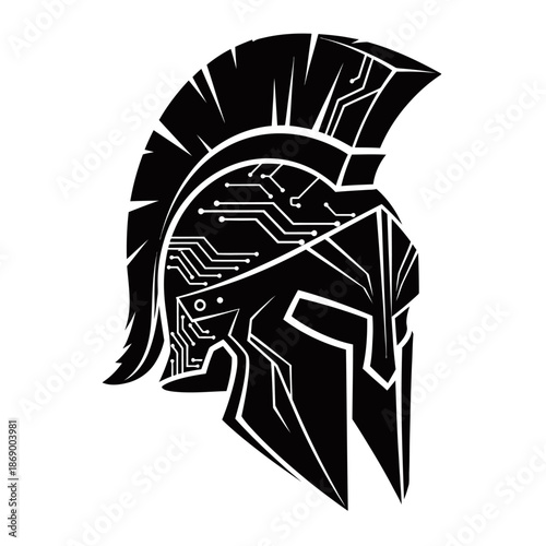 A stylized black Spartan helmet with integrated circuit board patterns, symbolizing technology and ancient warfare.