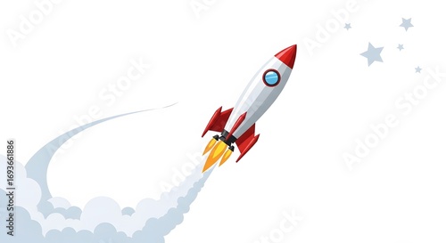 A stylized illustration of a red and white rocket ship ascending into a white sky, leaving a trail of smoke and fire, with distant stars visible.