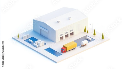 A stylized industrial building with a truck, surrounded by trees and storage areas, showcasing a clean, minimalist design.