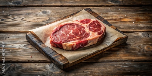 A succulent raw ribeye steak rests on butcher paper atop a rustic wooden cutting board