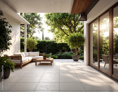 A sun-drenched patio area with contemporary wooden furniture and lush landscaping, showcasing a light beige tiled floor and large glass doors.