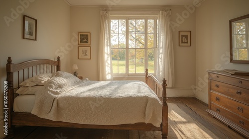 A sunlit bedroom with a wooden bed, soft linens, and a view of nature shining through large windows