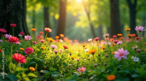 A sunlit meadow bursting with vibrant wildflowers, bathed in golden hour light, creating a serene and peaceful landscape of blooming flora