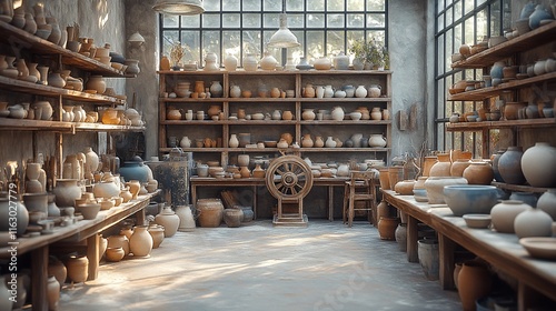 A sunlit pottery studio filled with earthenware vessels