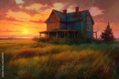 A sunset scene with a charming house nestled in a beautiful field Generative Ai