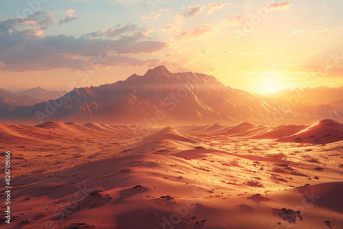 A surreal desert landscape bathed in golden sunlight, with towering sand dunes stretching as far as the eye can see. Concept of desert adventure and tranquility. Generative Ai.