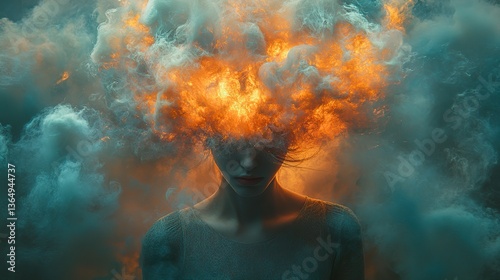 A surreal image depicts a woman with hair exploding from her head, symbolizing stress, information overload, burnout, and mental health challenges.